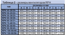 Таблица №2 Размеры вентилятора RPH