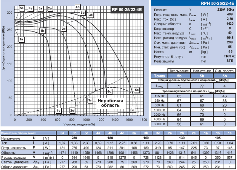В табл. 4 указаны технические характеристики вентиляторов RРН в зависимости от макс, мощности, в одном столбце - в зависимости от макс, суммарного давления, а в другом - от макс, расхода воздуха. В большинстве случаев важнее знать взаимное соотношение: расход воздуха-давление, чем максимальные значения отдельных величин. График 1 служит для быстрого выбора необходимого вентилятора и для взаимного сравнения вентиляторов RРН. На графике показаны только характеристики каждого вентилятора при номинальном напряжении, т.е. без регулятора или с регулятором, включенным на 5 ступень мощности. В разделе данных указаны все основные характеристики вентиляторов RРН. Шумовые параметры „уровень акустической мощности на всасывании" и „уровень акустической мощности на нагнетании" вентилятора измеряются согласно IS0 3743-2. Шумовые параметры „уровень акустической мощности в окр. простр." расчитываются по значению акустической мощности, измеренной согласно IS0 3743-2 у вентилятора без изоляции, а также величины шумоизоляции корпуса, измеренной согласно ЕN IS0 11546-1. Мощностные характе-ристики вентиляторов измеряются согласно нормам DIN 24 163 и АМСА Stапdart 210-74.