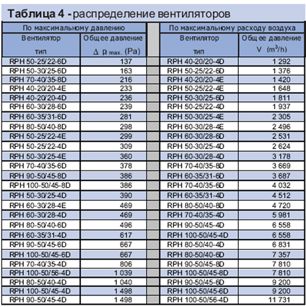 Вентиляторы RРН имеют 9 типоразмеров в зависимости от размеров соединительного фланца (АхВ). Каждому типоразмеру соответствует несколько вентиляторов, отличающихся количеством полюсов электромотора. При выборе вентилятора на требуемый расход воздуха и давление, действует правило: вентиляторы с большим количеством полюсов достигают требуемых параметров при более низких оборотах, что снижает шум и увеличивает ресурс их работы. Вентиляторы с большим количеством полюсов также имеют меньшую скорость воздуха в сечении, что снижает потери давления в воздуховоде и сетевом оборудовании, хотя и увеличивает капиталовложения. Серия выпускаемых однофазных и трехфазных вентиляторов RРН дает проектировщикам возможность оптимизировать все параметры при выборе вентиляционных установок с расходом воздуха до 9200 м3/ч.