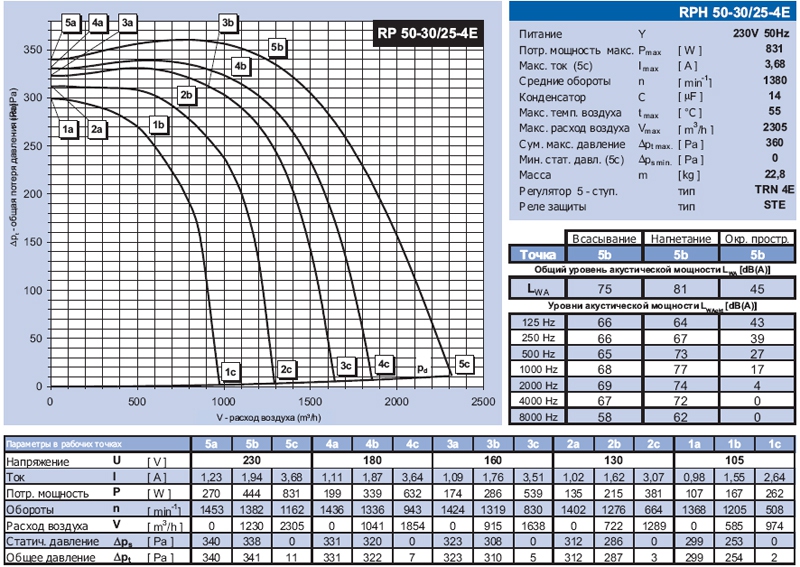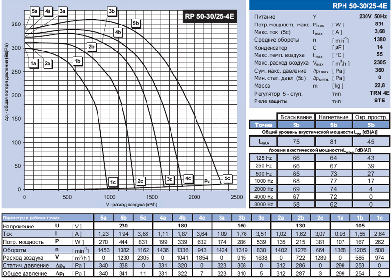 В табл. 4 указаны технические характеристики вентиляторов RРН в зависимости от макс, мощности, в одном столбце - в зависимости от макс, суммарного давления, а в другом - от макс, расхода воздуха. В большинстве случаев важнее знать взаимное соотношение: расход воздуха-давление, чем максимальные значения отдельных величин. График 1 служит для быстрого выбора необходимого вентилятора и для взаимного сравнения вентиляторов RРН. На графике показаны только характеристики каждого вентилятора при номинальном напряжении, т.е. без регулятора или с регулятором, включенным на 5 ступень мощности. В разделе данных указаны все основные характеристики вентиляторов RРН. Шумовые параметры „уровень акустической мощности на всасывании" и „уровень акустической мощности на нагнетании" вентилятора измеряются согласно IS0 3743-2. Шумовые параметры „уровень акустической мощности в окр. простр." расчитываются по значению акустической мощности, измеренной согласно IS0 3743-2 у вентилятора без изоляции, а также величины шумоизоляции корпуса, измеренной согласно ЕN IS0 11546-1. Мощностные характе-ристики вентиляторов измеряются согласно нормам DIN 24 163 и АМСА Stапdart 210-74.