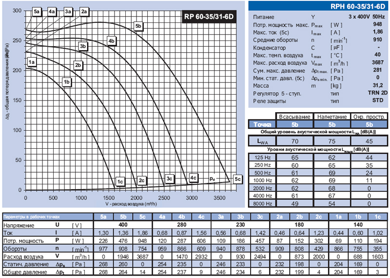 В табл. 4 указаны технические характеристики вентиляторов RРН в зависимости от макс, мощности, в одном столбце - в зависимости от макс, суммарного давления, а в другом - от макс, расхода воздуха. В большинстве случаев важнее знать взаимное соотношение: расход воздуха-давление, чем максимальные значения отдельных величин. График 1 служит для быстрого выбора необходимого вентилятора и для взаимного сравнения вентиляторов RРН. На графике показаны только характеристики каждого вентилятора при номинальном напряжении, т.е. без регулятора или с регулятором, включенным на 5 ступень мощности. В разделе данных указаны все основные характеристики вентиляторов RРН. Шумовые параметры „уровень акустической мощности на всасывании" и „уровень акустической мощности на нагнетании" вентилятора измеряются согласно IS0 3743-2. Шумовые параметры „уровень акустической мощности в окр. простр." расчитываются по значению акустической мощности, измеренной согласно IS0 3743-2 у вентилятора без изоляции, а также величины шумоизоляции корпуса, измеренной согласно ЕN IS0 11546-1. Мощностные характе-ристики вентиляторов измеряются согласно нормам DIN 24 163 и АМСА Stапdart 210-74.