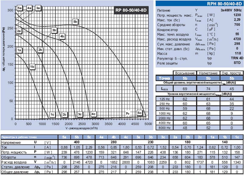 В табл. 4 указаны технические характеристики вентиляторов RРН в зависимости от макс, мощности, в одном столбце - в зависимости от макс, суммарного давления, а в другом - от макс, расхода воздуха. В большинстве случаев важнее знать взаимное соотношение: расход воздуха-давление, чем максимальные значения отдельных величин. График 1 служит для быстрого выбора необходимого вентилятора и для взаимного сравнения вентиляторов RРН. На графике показаны только характеристики каждого вентилятора при номинальном напряжении, т.е. без регулятора или с регулятором, включенным на 5 ступень мощности. В разделе данных указаны все основные характеристики вентиляторов RРН. Шумовые параметры „уровень акустической мощности на всасывании" и „уровень акустической мощности на нагнетании" вентилятора измеряются согласно IS0 3743-2. Шумовые параметры „уровень акустической мощности в окр. простр." расчитываются по значению акустической мощности, измеренной согласно IS0 3743-2 у вентилятора без изоляции, а также величины шумоизоляции корпуса, измеренной согласно ЕN IS0 11546-1. Мощностные характе-ристики вентиляторов измеряются согласно нормам DIN 24 163 и АМСА Stапdart 210-74.