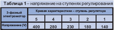 Электромоторы вентиляторов RР могут эксплуатироваться в пределах от 25% до 100% номинального напряжения. В табл.1 представлена зависимость