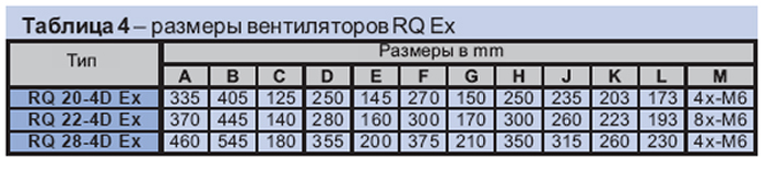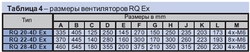 На рис. 6 и в таблице 4 указаны данные об основных размерах вентиляторов типа RQ в исполнении Ех.