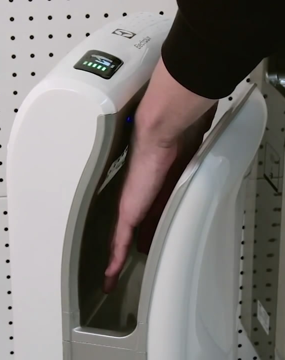 Прибор приводится в действие бесконтактно за счет чувствительного инфракрасного датчика. Он срабатывает в тот момент, когда пользователь подносит руки к воздуховыпускному отверстию и отключает прибор ровно тогда, когда пользователь их убирает. Такой способ включения прибора обеспечивает большую гигиеничность относительно контактного способа и экономию электроэнергии за счет более точных и коротких интервалов включения и отключения.