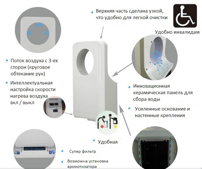 - Эргономичная инновация (пользователи сушат руки так, как они моют их)
