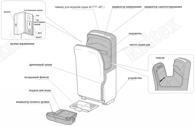 Сушилка для рук Ksitex M-6666R JET включаются без прикосновения к ней рук, т.к. она оснащена оптическим сенсором, который при приближении рук автоматически активирует нагрев и вентилятор. Не требуется касаться сенсора и корпуса сушилки. Во время сушки держите руки в струе теплого воздуха. После удаления рук из этой области сушилка Ksitex M-6666R JET выключается.