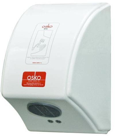 Сушилка для рук OSKO Mini включаются без прикосновения к ней рук, т.к. она оснащена оптическим сенсором, который при приближении рук автоматически активирует нагрев и вентилятор. Не требуется касаться сенсора и корпуса сушилки. Область срабатывания находится на расстоянии 6-15 см ниже решетки выхода теплого воздуха. Во время сушки держите руки в струе теплого воздуха. После удаления рук из этой области по истечении примерно 3-8 секунд сушилка выключается.