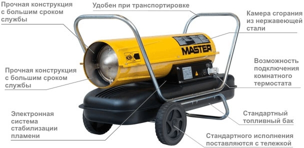Простая эксплуатация. Пушка «Мастер-150» оснащена электронной системой стабилизации пламени, индикатором уровня дизельного топлива. На входе установлен воздушный фильтр, позволяющий работать в запыленных помещениях.