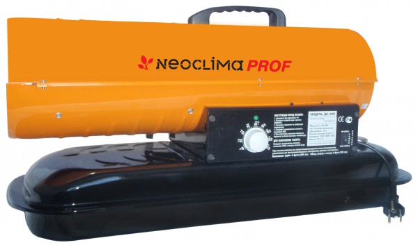Дизельные калориферы прямого нагрева NEOCLIMA NPD-20 продукты сгорания выбрасывают непосредственно в обогреваемое помещение. Сгорание происходит принудительным образом в камере сгорания, и весь горячий воздух нагнетается в окружающее пространство. Это дает высокий КПД, доходящий почти до 100%, но требует от помещений доступность для проветривания. В камеру сгорания дизельных обогревателей прямого нагрева NEOCLIMA нагнетается воздух и поступает дизельное топливо при помощи компрессора.