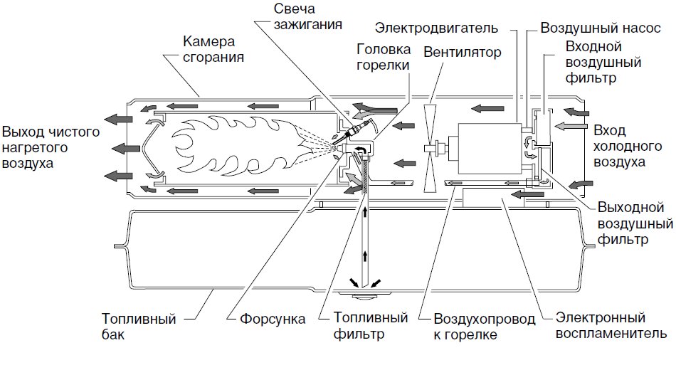 Дизельные калориферы прямого нагрева NEOCLIMA NPD-26C продукты сгорания выбрасывают непосредственно в обогреваемое помещение. Сгорание происходит принудительным образом в камере сгорания, и весь горячий воздух нагнетается в окружающее пространство. Это дает высокий КПД, доходящий почти до 100%, но требует от помещений доступность для проветривания. В камеру сгорания дизельных обогревателей прямого нагрева NEOCLIMA нагнетается воздух и поступает дизельное топливо при помощи компрессора.