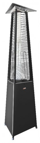 Газовый уличный обогреватель Falo с живым полутораметровым пламенем, заключенным в колбу из закаленного стекла, в металлическом корпусе.