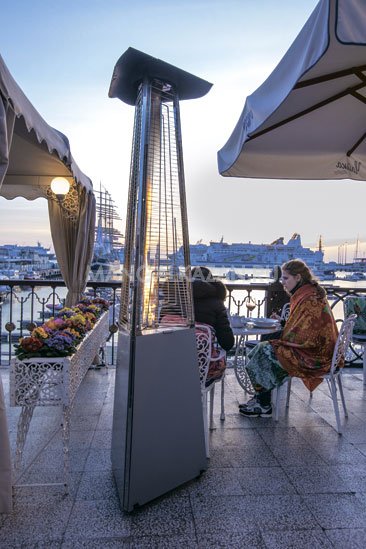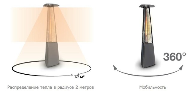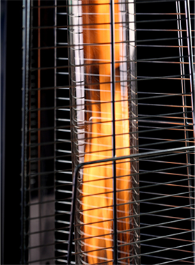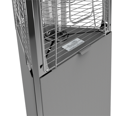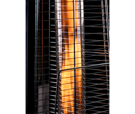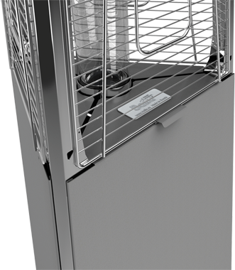 Уличный камин изготовлен из устойчивой к коррозии легированной нержавеющей стали и защищен от попадания атмосферных осадков сверху четырехгранным отражателем, площадь поверхности которого составляет 0,5 м². За безопасность эксплуатации отвечает многоуровневая система защиты. Датчик наклона отключает пламя при наклоне газового обогревателя более чем на 45°, термоэлектрический датчик и электромагнитный клапан сразу же останавливают подачу газа в критических ситуациях, таких как затухание пламени или утечка газа. За счёт встроенной колёсной базы обогреватель свободно и безопасно можно перемещать по любой поверхности.