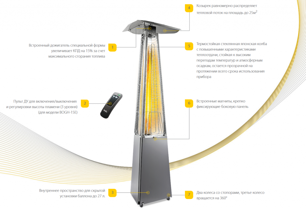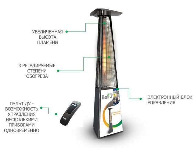 Уникальная особенность обогревателя Ballu BOGH-15 в том, что запуск, регулировка высоты пламени и выключение можно осуществлять как вручную – на блоке управления, расположенном непосредственно на приборе, так и при помощи пульта дистанционного управления, входящего в комплект с изделием (для модели BOGH-15E). Дистанционное управление даёт возможность включения, выключения, а также регулировки высоты пламени одновременно или раздельно у нескольких приборов Ballu BOGH-15E.