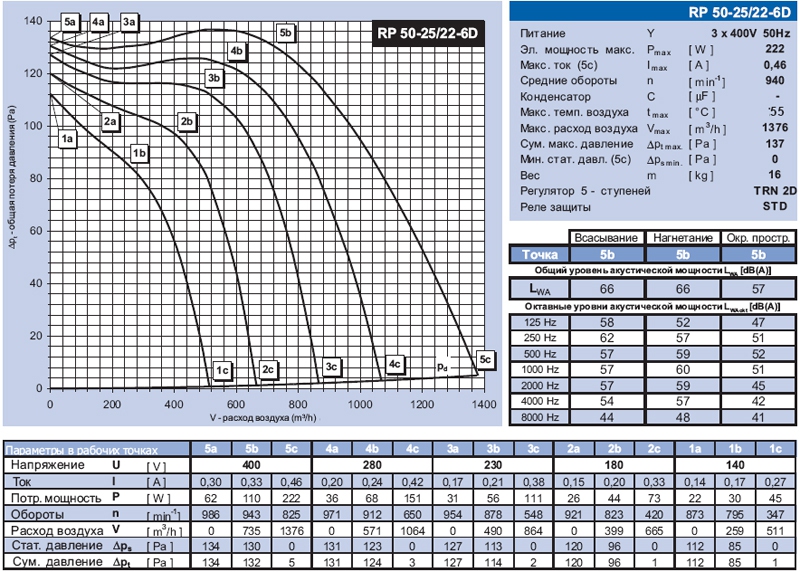 Вентиляторы RР регулируются в широком диапазоне, а при наличии пятиступенчатых регуляторов ТRN, могут эксплуатироваться на одной из пяти ступеней мощности. Каждой ступени мощности, установленной на регуляторе (ступень 5 -1) отвечает одна из кривых характеристик 5, 4, 3, 2, 1. Если к вентилятору не подключен регулятор, его можно эксплуатировать только на кривой 5 . Характеристика конкретной сети воздуховодов имеет параболическую зависимость \/-Δрt, (например, кривая 6). Действительная рабочая точка системы 8 (вентилятор-сеть), будет находиться на пересечении кривой вентилятора, установленного на определенную ступень и кривой подсоединенной сети. Мощность вентилятора, регулируемого по напряжению, зависит от нагрузки, поэтому меняются не только напряжение и обороты, но также ток и потр. мощность. Таблицы характеристик показывают изменение этих величин всегда для трех выбранных точек каждой рабочей характеристики, например 5а, 5Ь, 5с характеристики 5.