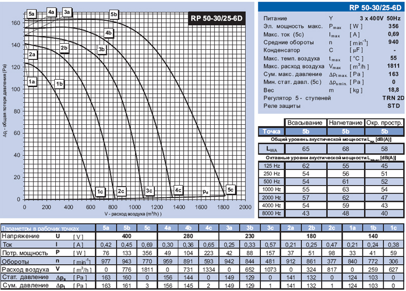 Вентиляторы RР регулируются в широком диапазоне, а при наличии пятиступенчатых регуляторов ТRN, могут эксплуатироваться на одной из пяти ступеней мощности. Каждой ступени мощности, установленной на регуляторе (ступень 5 -1) отвечает одна из кривых характеристик 5, 4, 3, 2, 1. Если к вентилятору не подключен регулятор, его можно эксплуатировать только на кривой 5 . Характеристика конкретной сети воздуховодов имеет параболическую зависимость \/-Δрt, (например, кривая 6). Действительная рабочая точка системы 8 (вентилятор-сеть), будет находиться на пересечении кривой вентилятора, установленного на определенную ступень и кривой подсоединенной сети. Мощность вентилятора, регулируемого по напряжению, зависит от нагрузки, поэтому меняются не только напряжение и обороты, но также ток и потр. мощность. Таблицы характеристик показывают изменение этих величин всегда для трех выбранных точек каждой рабочей характеристики, например 5а, 5Ь, 5с характеристики 5.