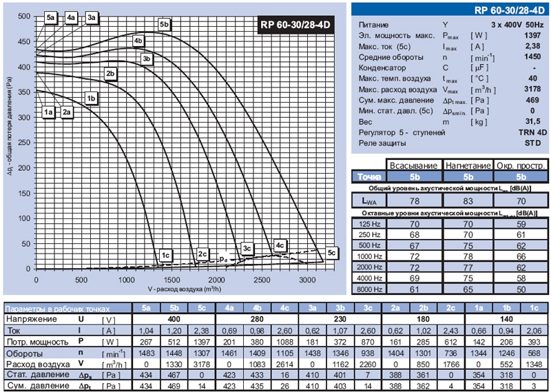 Вентиляторы RР регулируются в широком диапазоне, а при наличии пятиступенчатых регуляторов ТRN, могут эксплуатироваться на одной из пяти ступеней мощности. Каждой ступени мощности, установленной на регуляторе (ступень 5 -1) отвечает одна из кривых характеристик 5, 4, 3, 2, 1. Если к вентилятору не подключен регулятор, его можно эксплуатировать только на кривой 5 . Характеристика конкретной сети воздуховодов имеет параболическую зависимость \/-Δрt, (например, кривая 6). Действительная рабочая точка системы 8 (вентилятор-сеть), будет находиться на пересечении кривой вентилятора, установленного на определенную ступень и кривой подсоединенной сети. Мощность вентилятора, регулируемого по напряжению, зависит от нагрузки, поэтому меняются не только напряжение и обороты, но также ток и потр. мощность. Таблицы характеристик показывают изменение этих величин всегда для трех выбранных точек каждой рабочей характеристики, например 5а, 5Ь, 5с характеристики 5.