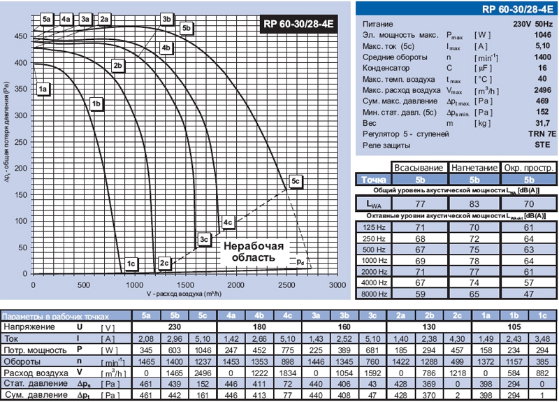 Вентиляторы RР регулируются в широком диапазоне, а при наличии пятиступенчатых регуляторов ТRN, могут эксплуатироваться на одной из пяти ступеней мощности. Каждой ступени мощности, установленной на регуляторе (ступень 5 -1) отвечает одна из кривых характеристик 5, 4, 3, 2, 1. Если к вентилятору не подключен регулятор, его можно эксплуатировать только на кривой 5 . Характеристика конкретной сети воздуховодов имеет параболическую зависимость \/-Δрt, (например, кривая 6). Действительная рабочая точка системы 8 (вентилятор-сеть), будет находиться на пересечении кривой вентилятора, установленного на определенную ступень и кривой подсоединенной сети. Мощность вентилятора, регулируемого по напряжению, зависит от нагрузки, поэтому меняются не только напряжение и обороты, но также ток и потр. мощность. Таблицы характеристик показывают изменение этих величин всегда для трех выбранных точек каждой рабочей характеристики, например 5а, 5Ь, 5с характеристики 5.