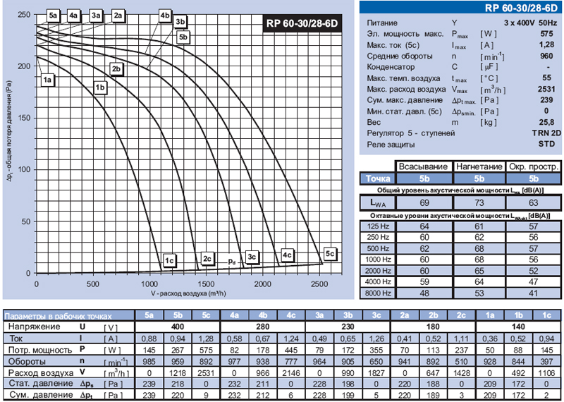 Вентиляторы RР регулируются в широком диапазоне, а при наличии пятиступенчатых регуляторов ТRN, могут эксплуатироваться на одной из пяти ступеней мощности. Каждой ступени мощности, установленной на регуляторе (ступень 5 -1) отвечает одна из кривых характеристик 5, 4, 3, 2, 1. Если к вентилятору не подключен регулятор, его можно эксплуатировать только на кривой 5 . Характеристика конкретной сети воздуховодов имеет параболическую зависимость \/-Δрt, (например, кривая 6). Действительная рабочая точка системы 8 (вентилятор-сеть), будет находиться на пересечении кривой вентилятора, установленного на определенную ступень и кривой подсоединенной сети. Мощность вентилятора, регулируемого по напряжению, зависит от нагрузки, поэтому меняются не только напряжение и обороты, но также ток и потр. мощность. Таблицы характеристик показывают изменение этих величин всегда для трех выбранных точек каждой рабочей характеристики, например 5а, 5Ь, 5с характеристики 5.