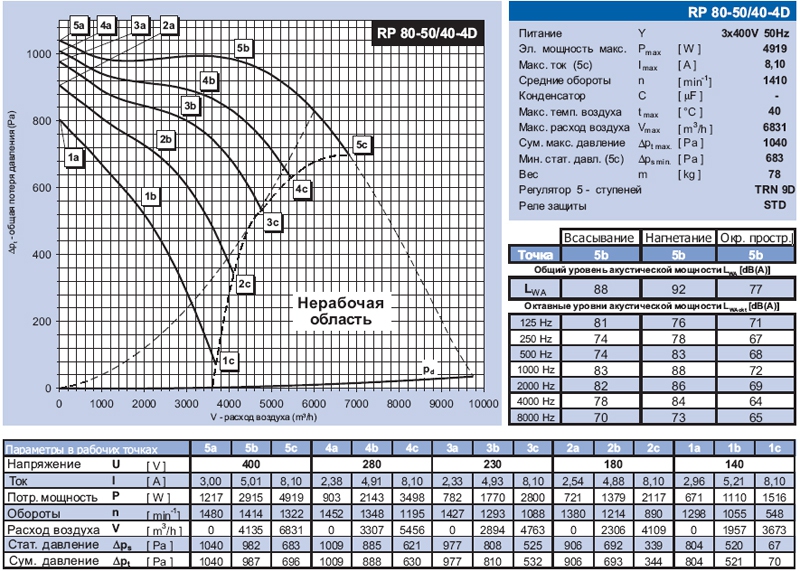Вентиляторы RР регулируются в широком диапазоне, а при наличии пятиступенчатых регуляторов ТRN, могут эксплуатироваться на одной из пяти ступеней мощности. Каждой ступени мощности, установленной на регуляторе (ступень 5 -1) отвечает одна из кривых характеристик 5, 4, 3, 2, 1. Если к вентилятору не подключен регулятор, его можно эксплуатировать только на кривой 5 . Характеристика конкретной сети воздуховодов имеет параболическую зависимость \/-Δрt, (например, кривая 6). Действительная рабочая точка системы 8 (вентилятор-сеть), будет находиться на пересечении кривой вентилятора, установленного на определенную ступень и кривой подсоединенной сети. Мощность вентилятора, регулируемого по напряжению, зависит от нагрузки, поэтому меняются не только напряжение и обороты, но также ток и потр. мощность. Таблицы характеристик показывают изменение этих величин всегда для трех выбранных точек каждой рабочей характеристики, например 5а, 5Ь, 5с характеристики 5.