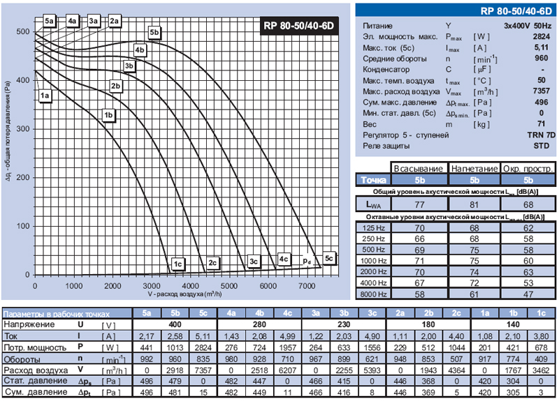 Вентиляторы RР регулируются в широком диапазоне, а при наличии пятиступенчатых регуляторов ТRN, могут эксплуатироваться на одной из пяти ступеней мощности. Каждой ступени мощности, установленной на регуляторе (ступень 5 -1) отвечает одна из кривых характеристик 5, 4, 3, 2, 1. Если к вентилятору не подключен регулятор, его можно эксплуатировать только на кривой 5 . Характеристика конкретной сети воздуховодов имеет параболическую зависимость \/-Δрt, (например, кривая 6). Действительная рабочая точка системы 8 (вентилятор-сеть), будет находиться на пересечении кривой вентилятора, установленного на определенную ступень и кривой подсоединенной сети. Мощность вентилятора, регулируемого по напряжению, зависит от нагрузки, поэтому меняются не только напряжение и обороты, но также ток и потр. мощность. Таблицы характеристик показывают изменение этих величин всегда для трех выбранных точек каждой рабочей характеристики, например 5а, 5Ь, 5с характеристики 5.