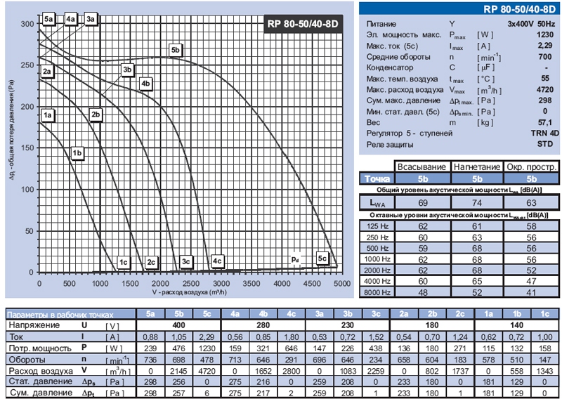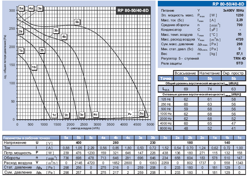 Вентиляторы RР регулируются в широком диапазоне, а при наличии пятиступенчатых регуляторов ТRN, могут эксплуатироваться на одной из пяти ступеней мощности. Каждой ступени мощности, установленной на регуляторе (ступень 5 -1) отвечает одна из кривых характеристик 5, 4, 3, 2, 1. Если к вентилятору не подключен регулятор, его можно эксплуатировать только на кривой 5 . Характеристика конкретной сети воздуховодов имеет параболическую зависимость \/-Δрt, (например, кривая 6). Действительная рабочая точка системы 8 (вентилятор-сеть), будет находиться на пересечении кривой вентилятора, установленного на определенную ступень и кривой подсоединенной сети. Мощность вентилятора, регулируемого по напряжению, зависит от нагрузки, поэтому меняются не только напряжение и обороты, но также ток и потр. мощность. Таблицы характеристик показывают изменение этих величин всегда для трех выбранных точек каждой рабочей характеристики, например 5а, 5Ь, 5с характеристики 5.
