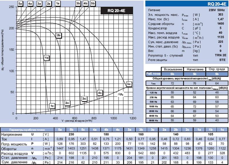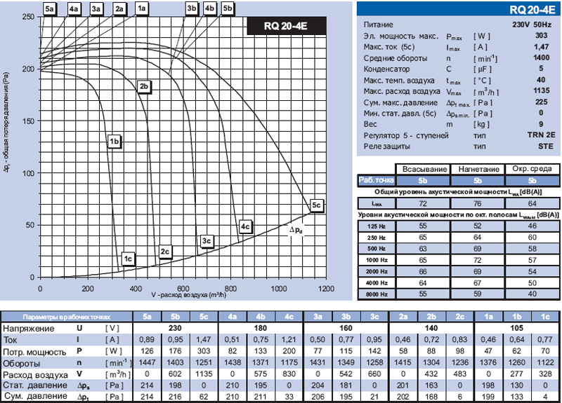 В обзорной таблице 5 представлены технические характеристики вентиляторов RQ, распределенных в первом столбце в зависимости от максимального суммарного давления, а в другом - в зависимости от максимального расхода воздуха. В большинстве случаев важнее знать взаимное соотношение расход воздуха - давление, чем только максимальные значения отдельных величин. График 1 служит для быстрого выбора необходимого вентилятора и для взаимного сравнения вентиляторов RQ. На графике показаны только максимальные характеристики каждого вентилятора при подключенном номинальном напряжении, т.е. без регулятора или же с регулятором, включенным на 5 ступень регулирования.