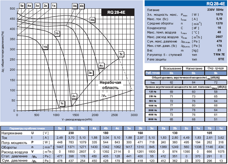 В обзорной таблице 5 представлены технические характеристики вентиляторов RQ, распределенных в первом столбце в зависимости от максимального суммарного давления, а в другом - в зависимости от максимального расхода воздуха. В большинстве случаев важнее знать взаимное соотношение расход воздуха - давление, чем только максимальные значения отдельных величин. График 1 служит для быстрого выбора необходимого вентилятора и для взаимного сравнения вентиляторов RQ. На графике показаны только максимальные характеристики каждого вентилятора при подключенном номинальном напряжении, т.е. без регулятора или же с регулятором, включенным на 5 ступень регулирования.