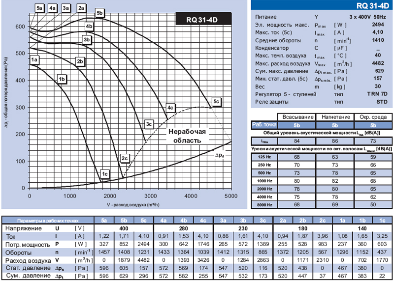 В обзорной таблице 5 представлены технические характеристики вентиляторов RQ, распределенных в первом столбце в зависимости от максимального суммарного давления, а в другом - в зависимости от максимального расхода воздуха. В большинстве случаев важнее знать взаимное соотношение расход воздуха - давление, чем только максимальные значения отдельных величин. График 1 служит для быстрого выбора необходимого вентилятора и для взаимного сравнения вентиляторов RQ. На графике показаны только максимальные характеристики каждого вентилятора при подключенном номинальном напряжении, т.е. без регулятора или же с регулятором, включенным на 5 ступень регулирования.