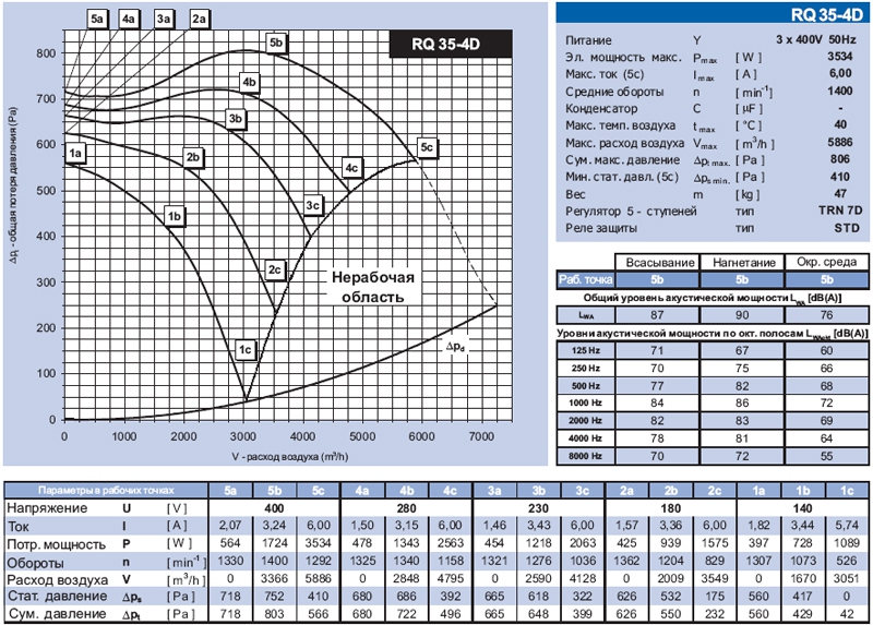 В обзорной таблице 5 представлены технические характеристики вентиляторов RQ, распределенных в первом столбце в зависимости от максимального суммарного давления, а в другом - в зависимости от максимального расхода воздуха. В большинстве случаев важнее знать взаимное соотношение расход воздуха - давление, чем только максимальные значения отдельных величин. График 1 служит для быстрого выбора необходимого вентилятора и для взаимного сравнения вентиляторов RQ. На графике показаны только максимальные характеристики каждого вентилятора при подключенном номинальном напряжении, т.е. без регулятора или же с регулятором, включенным на 5 ступень регулирования.