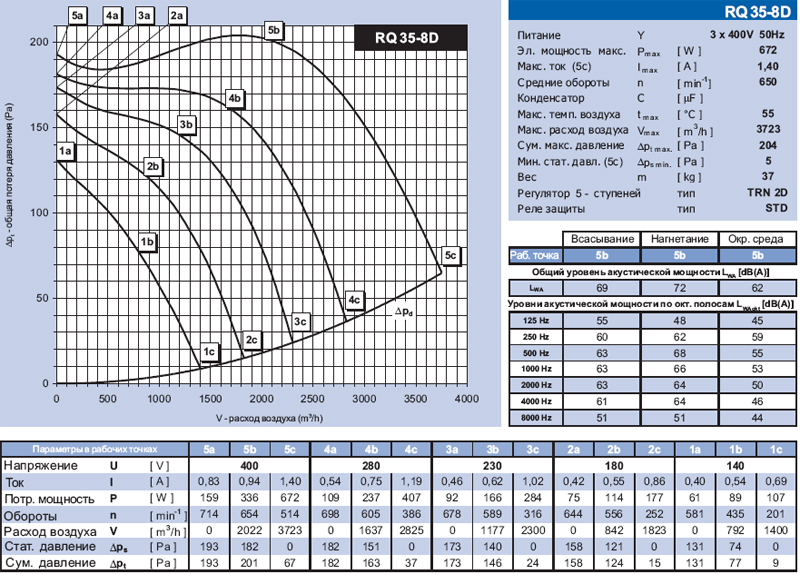 В обзорной таблице 5 представлены технические характеристики вентиляторов RQ, распределенных в первом столбце в зависимости от максимального суммарного давления, а в другом - в зависимости от максимального расхода воздуха. В большинстве случаев важнее знать взаимное соотношение расход воздуха - давление, чем только максимальные значения отдельных величин. График 1 служит для быстрого выбора необходимого вентилятора и для взаимного сравнения вентиляторов RQ. На графике показаны только максимальные характеристики каждого вентилятора при подключенном номинальном напряжении, т.е. без регулятора или же с регулятором, включенным на 5 ступень регулирования.