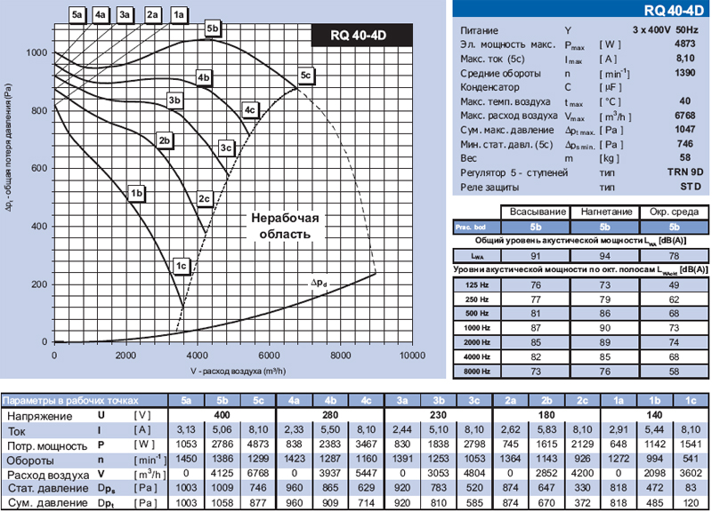 В обзорной таблице 5 представлены технические характеристики вентиляторов RQ, распределенных в первом столбце в зависимости от максимального суммарного давления, а в другом - в зависимости от максимального расхода воздуха. В большинстве случаев важнее знать взаимное соотношение расход воздуха - давление, чем только максимальные значения отдельных величин. График 1 служит для быстрого выбора необходимого вентилятора и для взаимного сравнения вентиляторов RQ. На графике показаны только максимальные характеристики каждого вентилятора при подключенном номинальном напряжении, т.е. без регулятора или же с регулятором, включенным на 5 ступень регулирования.