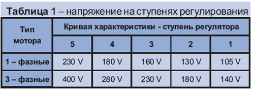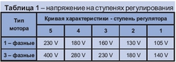 напряжения TRN можно регулировать производительность вентилятора на пяти ступенях с шагом примерно 20%, чему соответствует пять кривых зависимости давления и расхода на графике рабочих характеристик каждого вентилятора. В табл.1 представлена зависимость величины выходного напряжения от установленной ступени регулятора для 1-фазных и 3-фазных электромоторов. Величины отвечают электросети напряжением 400/230\/. В основном используются 1-фазные регуляторы ТRN. Можно также использовать более простые регуляторы ТRRЕ и ТRRD, однако они не выполняют защитных функций.