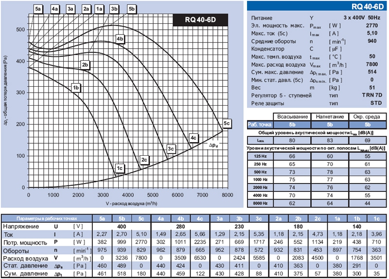 В обзорной таблице 5 представлены технические характеристики вентиляторов RQ, распределенных в первом столбце в зависимости от максимального суммарного давления, а в другом - в зависимости от максимального расхода воздуха. В большинстве случаев важнее знать взаимное соотношение расход воздуха - давление, чем только максимальные значения отдельных величин. График 1 служит для быстрого выбора необходимого вентилятора и для взаимного сравнения вентиляторов RQ. На графике показаны только максимальные характеристики каждого вентилятора при подключенном номинальном напряжении, т.е. без регулятора или же с регулятором, включенным на 5 ступень регулирования.